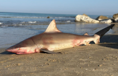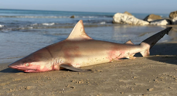 العثور على سمكة قرش حامل نافقة بعد أن علقت بشبكة صيد في شاطئ بيت يناي