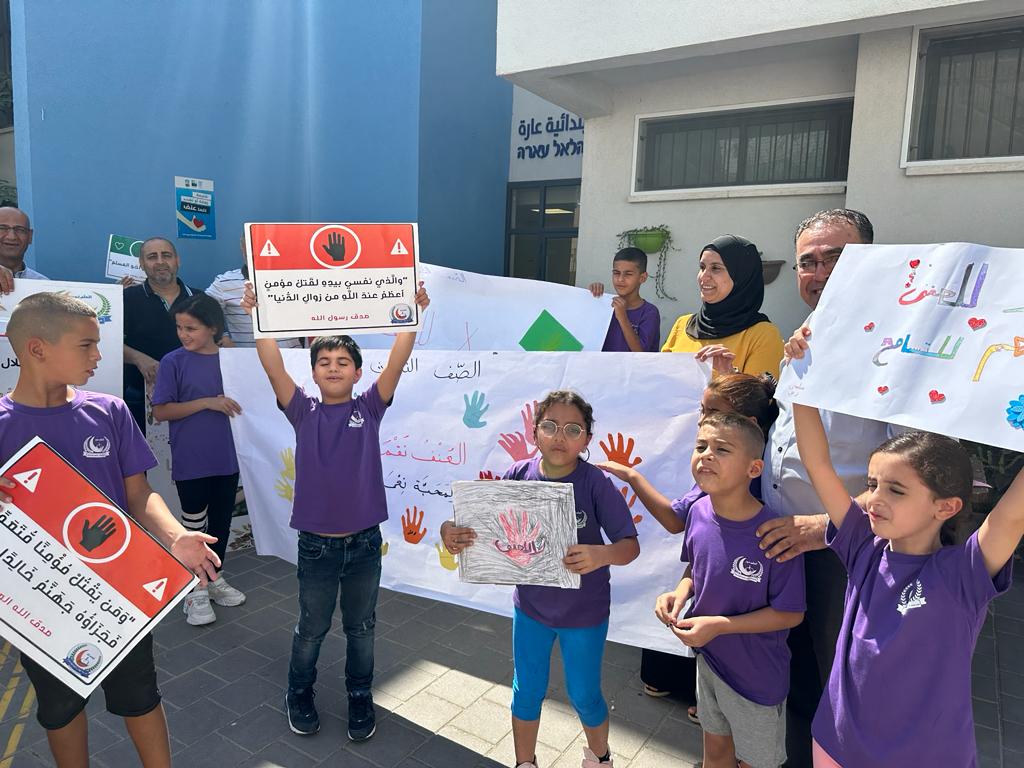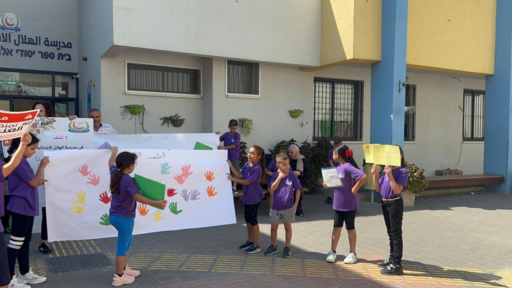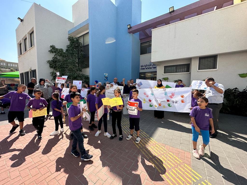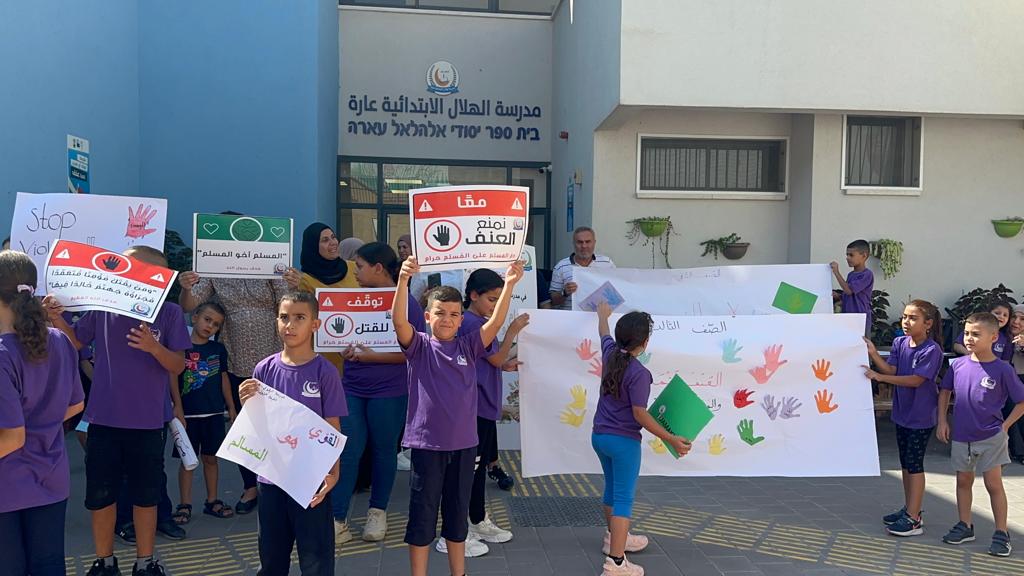 طلاب ابتدائية الهلال عارة يحتجون على الجريمة داخل مدرستهم : ‘بدنا نعيش بأمان‘