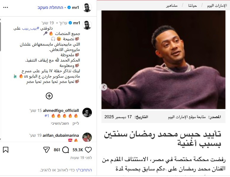 وكتب رمضان، في إطار ترويجه لأحدث أغانيه، "بيب بيب"، قائلاً: دلوقتي بيب بيب على جميع المنصات.. نصيحة.. اللي ما بيحبناش ما يسمعهاش علشان ما يروحش الانعاش.. ملحوظة: الحكم الحمد لله مع إيقاف التنفيذ.. ومعلومة لينك تذاكر حفلة 17 يناير على مسرح ماديسون سكوير جاردن ع البايو.. تحيا مصر تحيا مصر تحيا مصر".