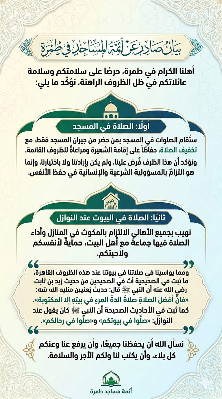 نهيب بجميع الأهالي الالتزام بالمكوث في المنازل وأداء الصلاة فيها جماعةً مع أهل البيت، حمايةً لأنفسكم ولأحبتكم.