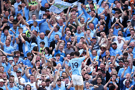 خوليان ألفاريز لاعب مانشستر سيتي يحتفل مع الجمهور بعد مباراة لفريقه امام تشيلسي ضمن مباريات الدوري الإنجليزي الممتاز لكرة القدم اليوم الأحد - (Photo by OLI SCARFF/AFP via Getty Images)