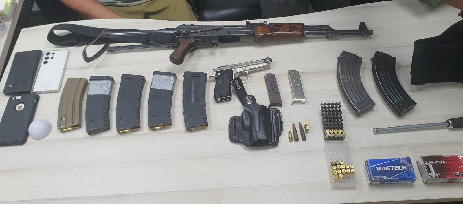 انشطة شرطة اسرائيل لمكافحة جرائم حيازة الأسلحة والوسائل القتالية، عملت قوات شرطة من مركز شرطة عتصيون في مديرية يهودا الليلة، بالتعاون مع قوة من الجيش الاسرائيلي من قاعدة عتصيون العسكرية، على تحديد وضبط أسلحة غير قانونية في بلدة بيت عومر. أثناء نشاط التفتيش والبحث، تم ضبط سلاح من طراز كلاشنيكوف ومسدس وامشاط ذخيرة وستائر وكميات كبيرة من الذخيرة في منزل في البلدة. تم القاء القبض على مشتبه فلسطيني من سكان المكان واحيل الى مركز الشرطة للتحقيق".