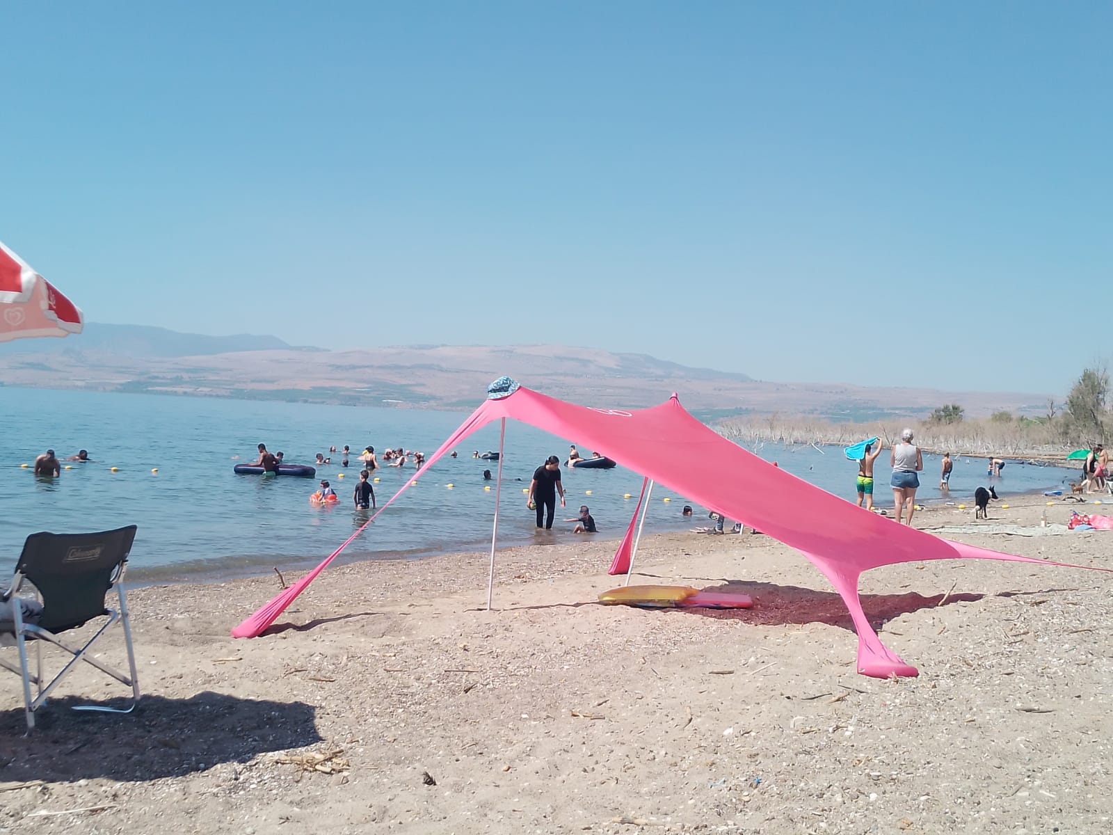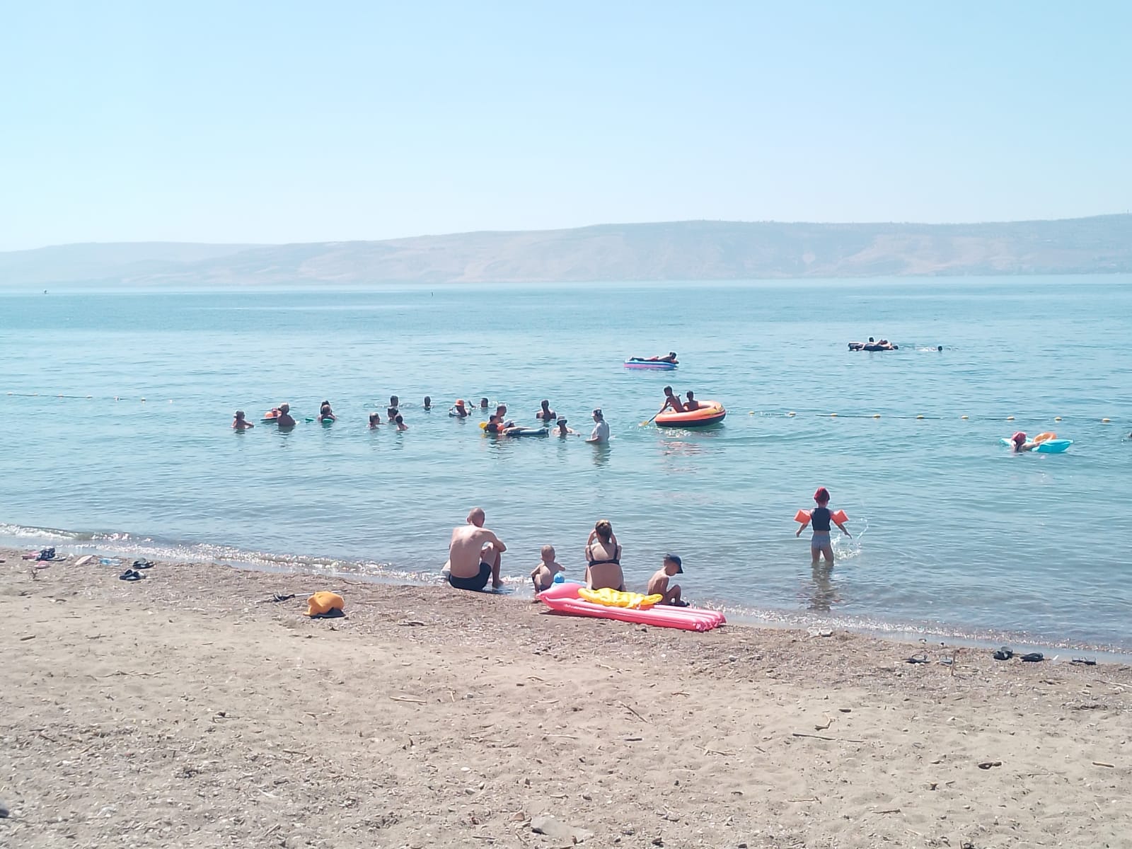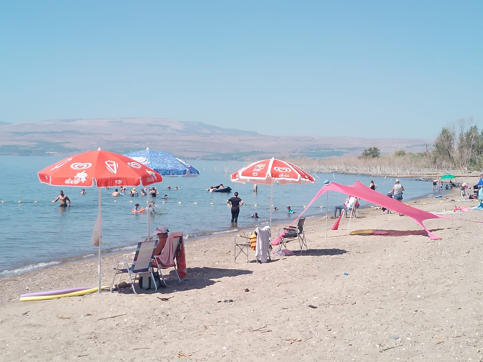 يقضون وقتهم في شواطئ بحيرة طبريا التابعة لاتحاد المدن طبريا ، مستغلين عطلة عيد رأس السنة العبرية .