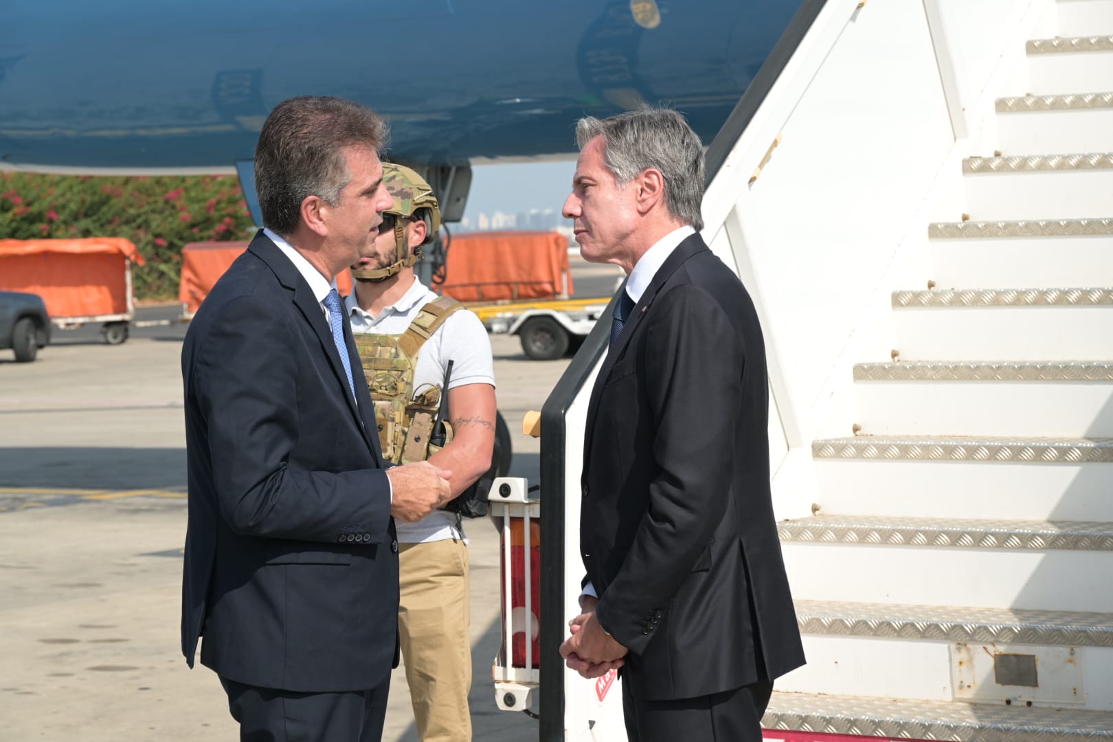 استقبل وزير الخارجية الإسرائيلي ايلي كوهين، وزير الخارجية الأمريكي أنطوني بلينكن، الذي وصل الى البلاد في زيارة تضامينة ودعم لإسرائيل في ظل الحرب الدائرة. ومن المنتظر أن يعقد الوزير الأمريكي