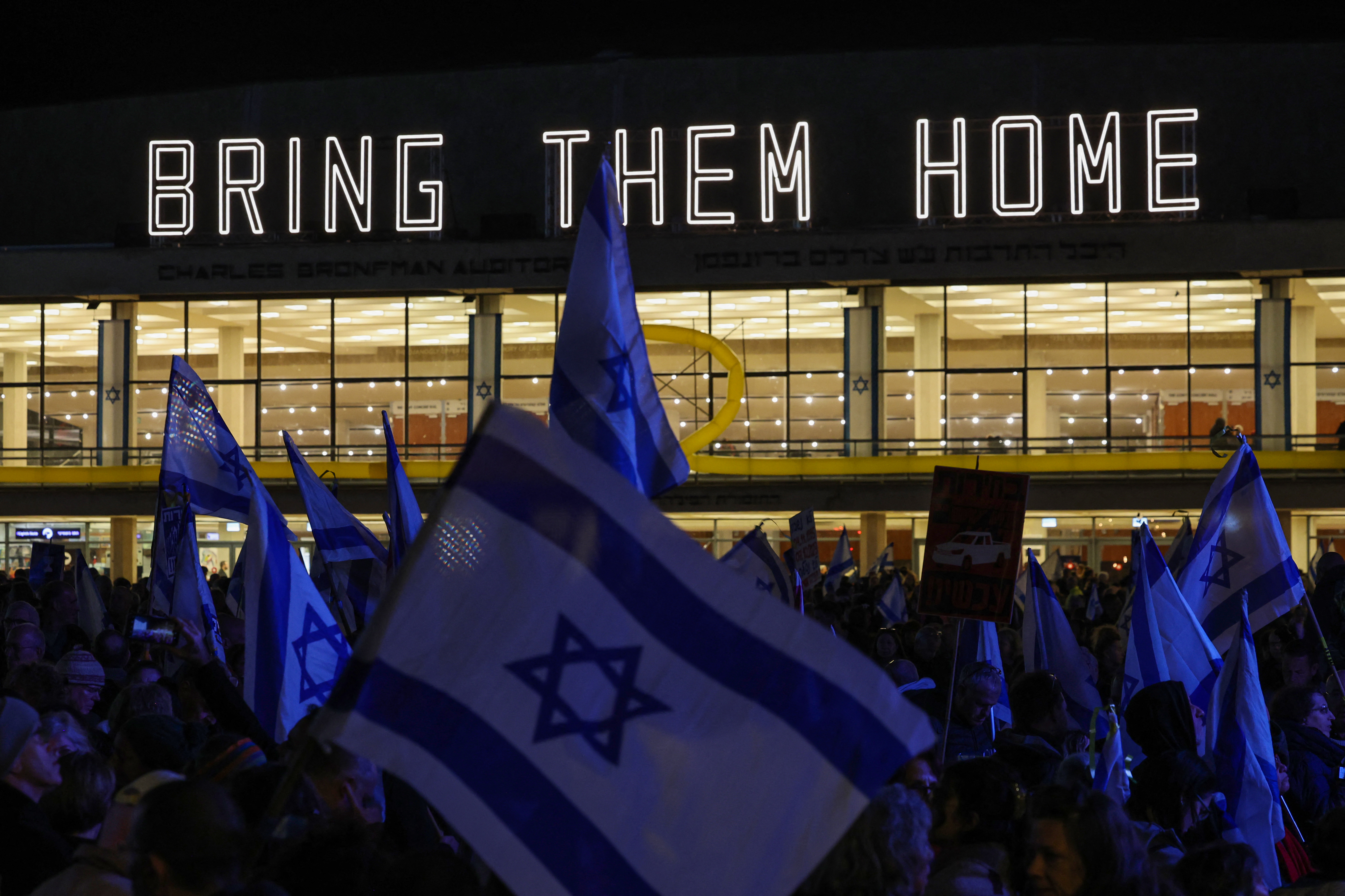 في هذا السياق ، فان الالاف يتظاهرون أيضا في ساحة المختطفين في تل أبيب ، للمطالبة باعادة المختطفين .