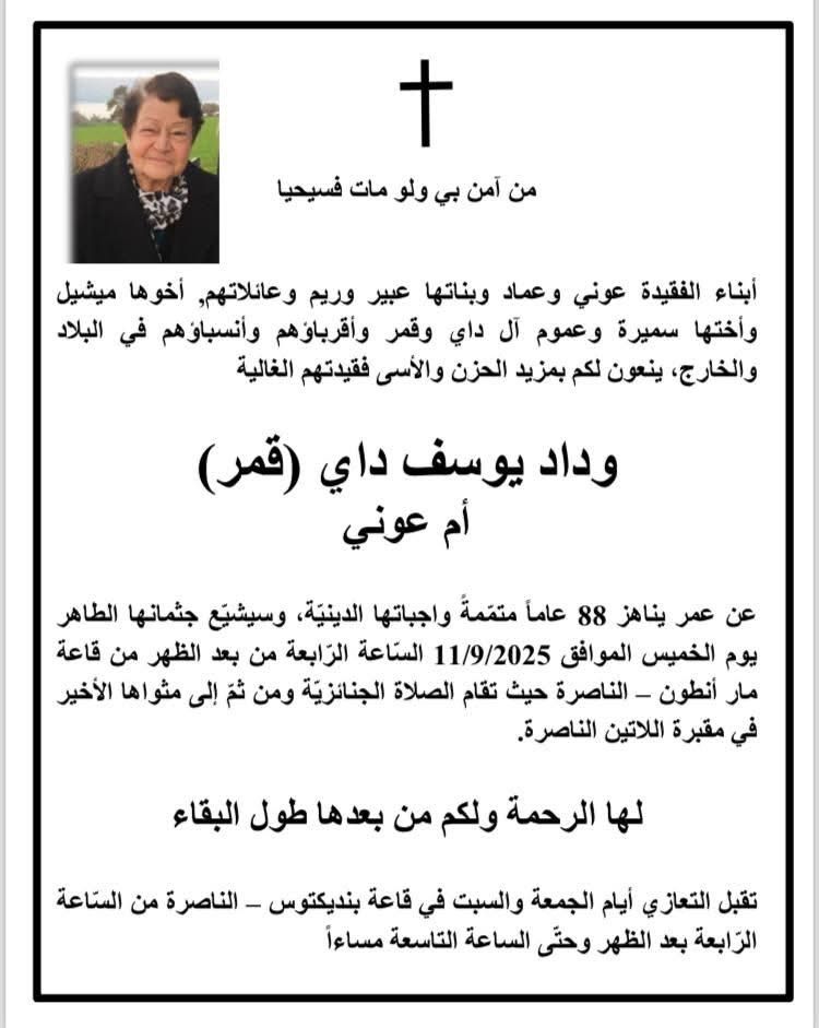 انتقلت الى رحمة الله تعالى وداد يوسف داي ( قمر ) أم عوني عن عمر ناهز الـ 88 عاما ، وسيشيع جثمانها الطاهر غدا الخميس الساعة الرابعة بعد الظهر من قاعة مار أنطون - الناصرة ، حيث تقام الصلاة الجنائزية ومن ثم الى مثواها الاخير