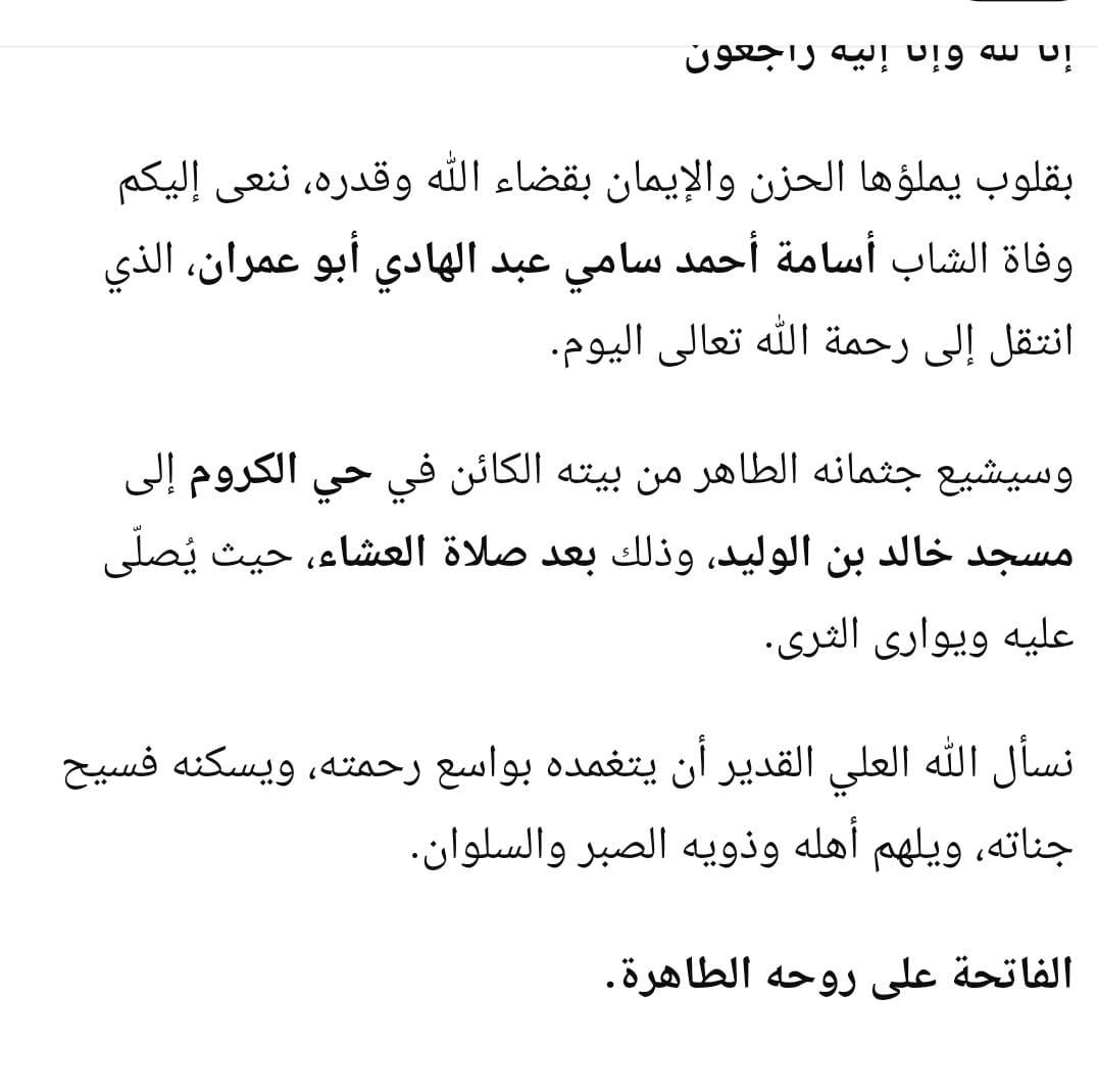 انتقل الى رحمة الله تعالى أسامة أحمد سامي عبد الهادي أبو عمران ، وسيشيع جثمانه الطاهر من بيته الكائن في حي الكروم الى مسجد خالد بن الوليد ، وذلك بعد صلاة العشاء