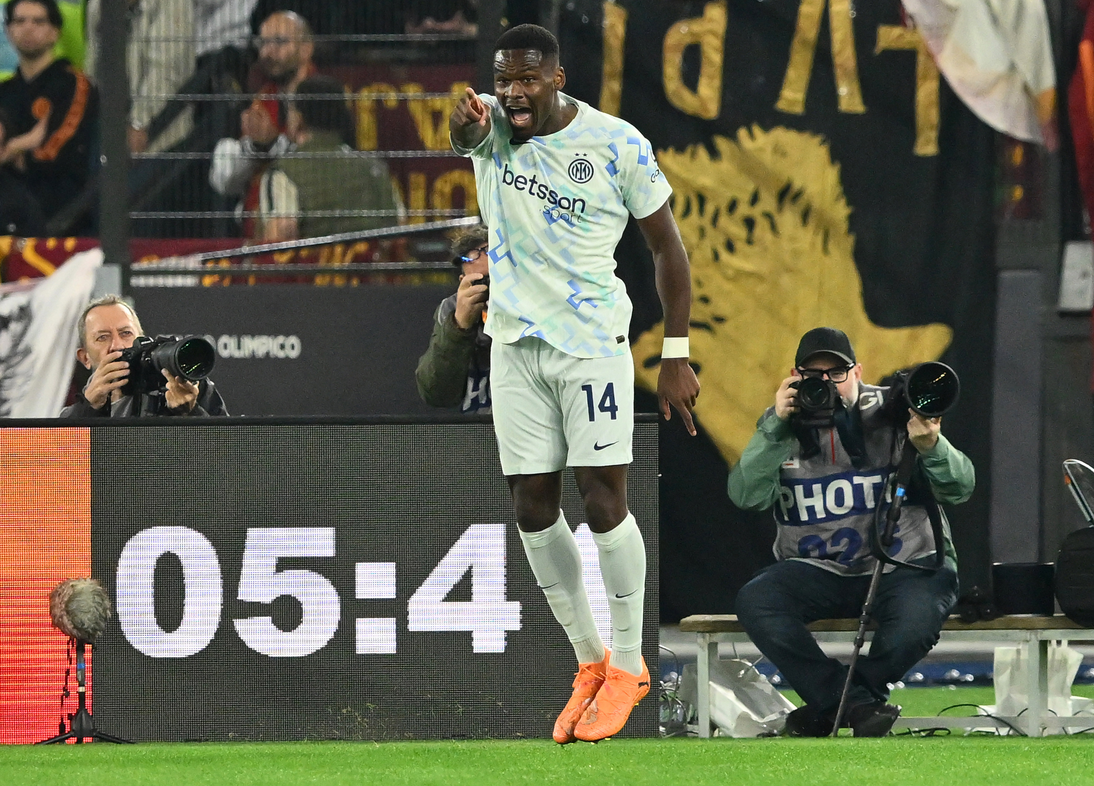 أنجي يوان بوني لاعب إنتر ميلان يحتفل بتسجيله الهدف الأول لفريقه في الفوز 1-صفر على روما في دوري الدرجة الأولى الإيطالي لكرة القدم يوم السبت. - (Photo by Giuseppe Bellini/Getty Images)