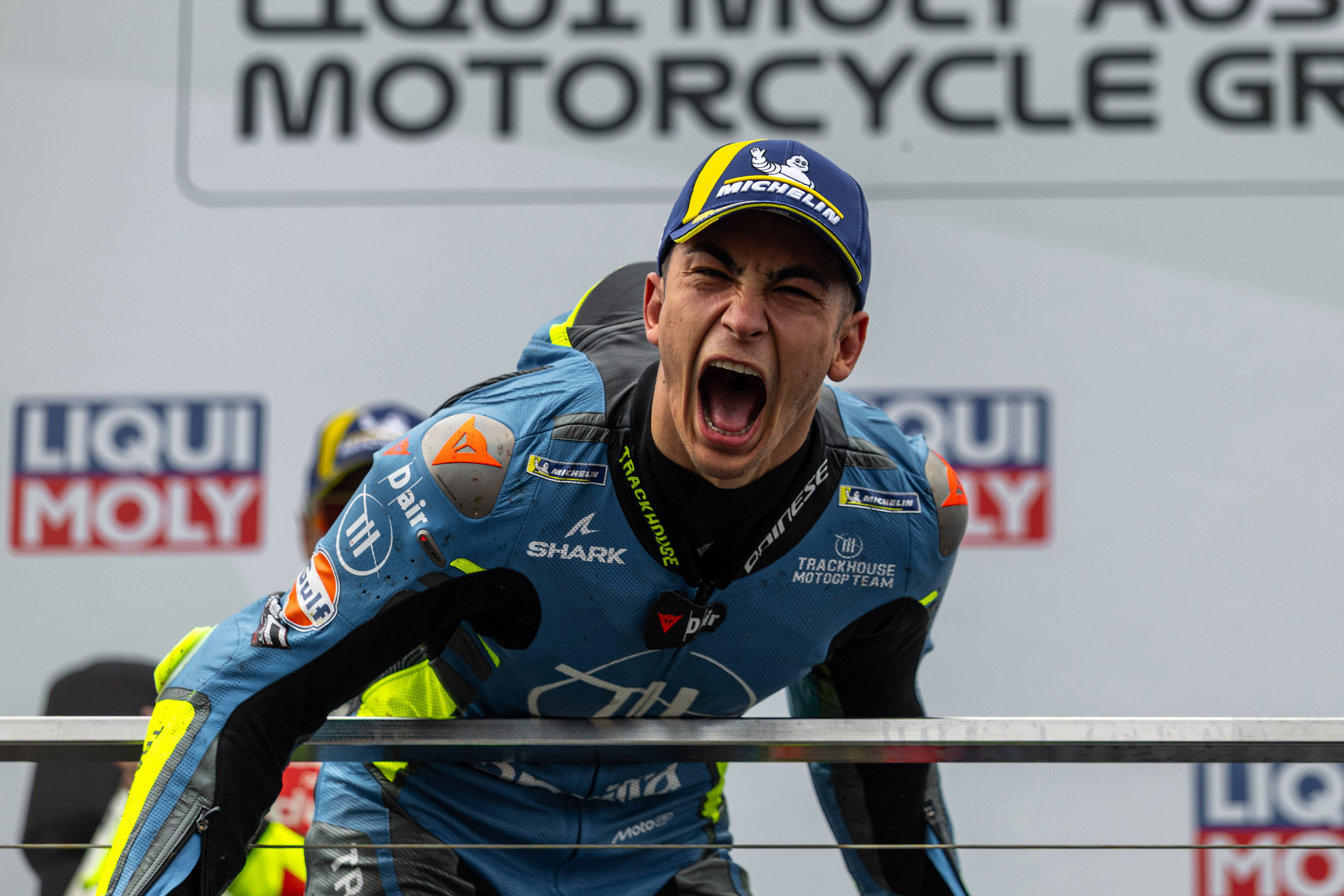 راؤول فرنانديز يحتفل بتحقيق أول انتصار في مسيرته ببطولة العالم للدراجات النارية بالفوز بسباق جائزة أستراليا الكبرى يوم الأحد - (Photo by Santanu Banik/MB Media/Getty Images)