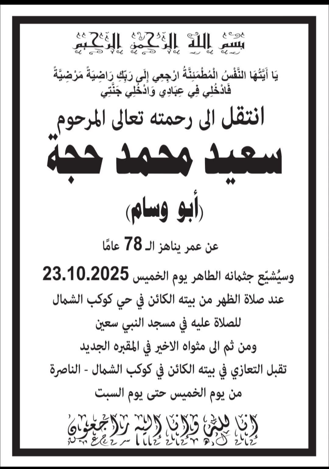 انتقل الى رحمة الله تعالى سعيد محمد حجة ( ابو وسام ) عن عمر ناهز الـ 78 عاما . وسيشيع جثمانه الطاهر غدا الخميس عند صلاة الظهر من بيته الكائن في حي كوكب الشمال للصلاة عليه في مسجد النبي سعين ،