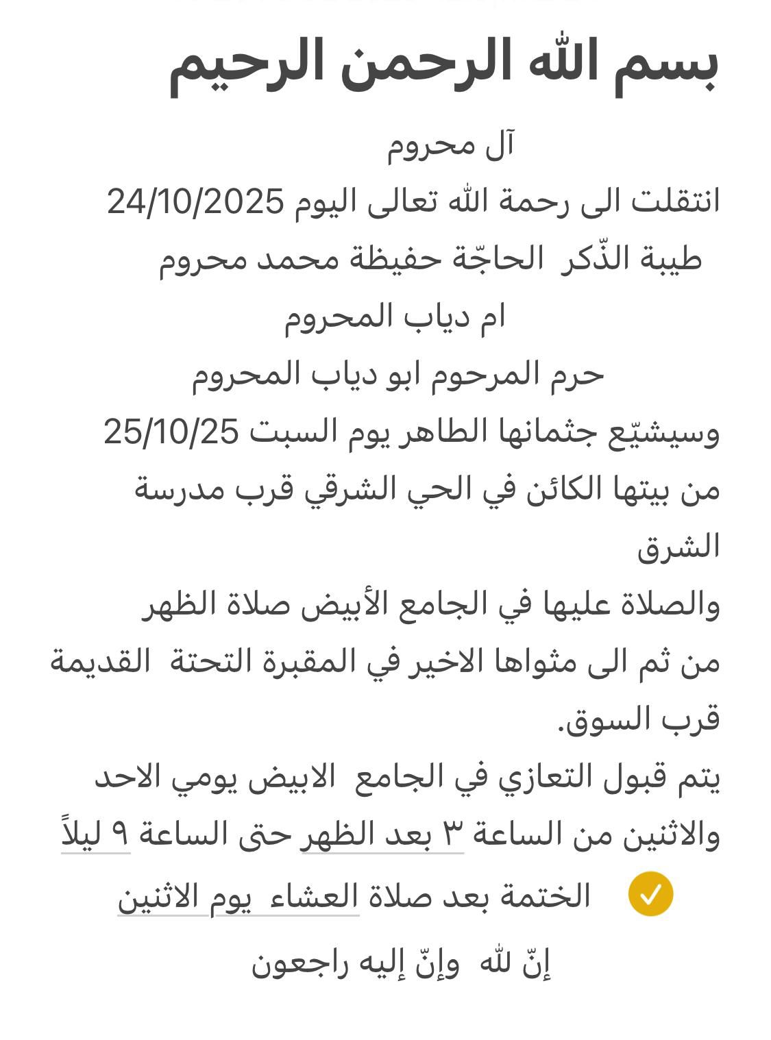 انتقلت الى رحمة الله تعالى الحاجة حفيظة محمد محروم ( ام دياب المحروم ) حرم المرحوم ابو دياب المرحوم ، وسيشيع جثمانها الطاهر غدا السبت من بيتها الكائن في الحي الشرقي قرب مدرسة الشرق ،