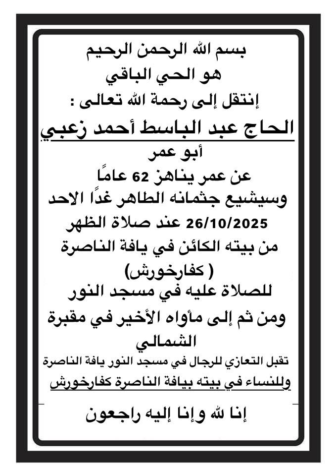 انتقل الى رحمة الله تعالى الحاج عبد الباسط أحمد زعبي ( أبو عمر ) عن عمر ناهز الـ 62 عاما ، وسيشيع جثمانه الطاهر غدا الأحد عند صلاة الظهر من بيته الكائن في يافة الناصرة ( كفارخورش) للصلاة عليه في مسجد النور