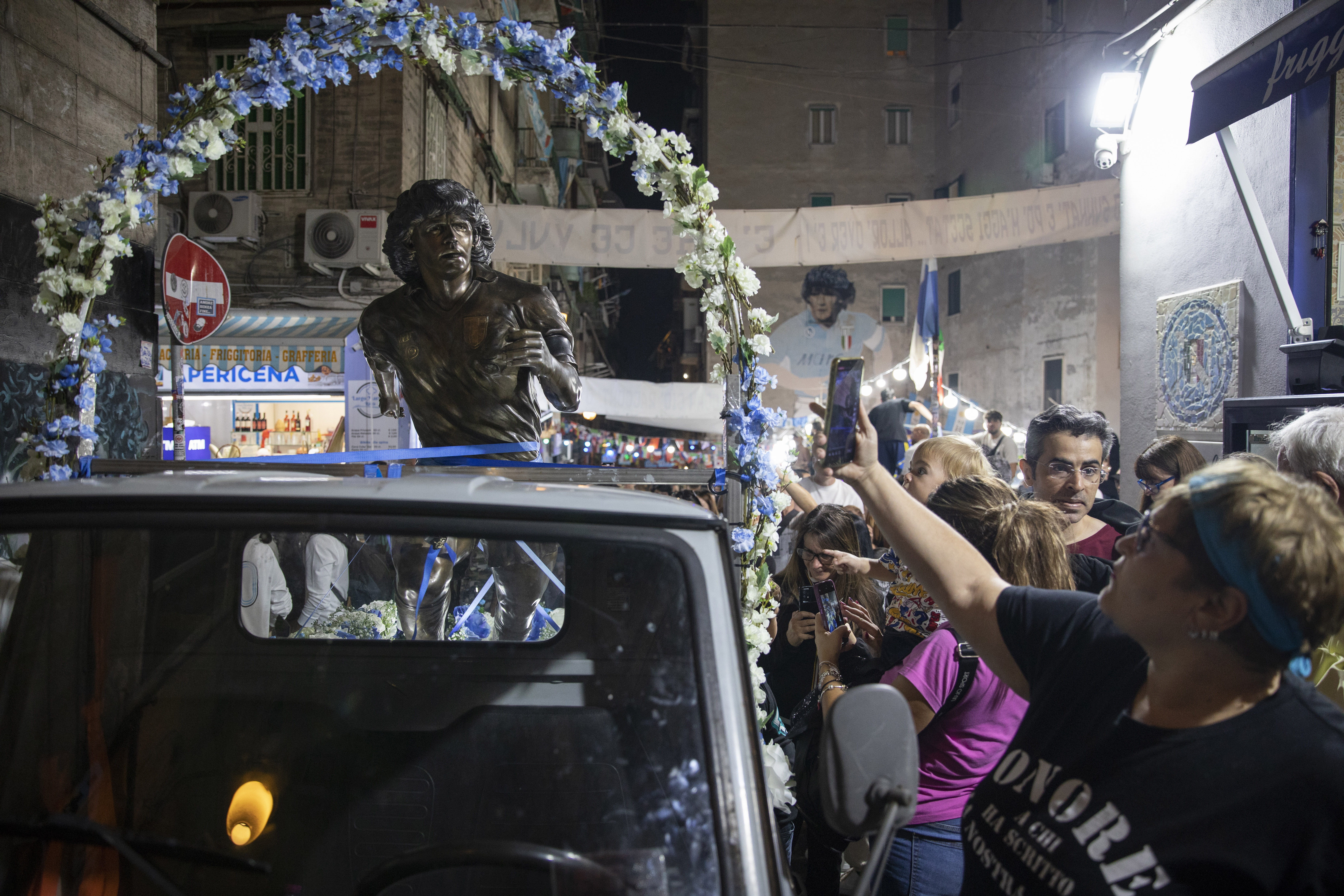 وتم إخراج تمثال مارادونا، الذي توفي بنوبة قلبية في عام 2020 وكان من المقرر أن يحتفل بعيد ميلاده الخامس والستين يوم الخميس، من متحف مارادونا في جولة تستغرق يوما واحدا في المدينة.