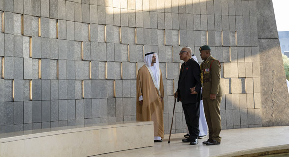 واستعرض رئيس جمهورية فيجي، يرافقه سموّ الشيخ زايد بن محمد بن زايد آل نهيان، حرس الشرف الذي اصطفَّ لتحيته، ثمَّ وضع إكليلاً من الزهور أمام نصب الشهيد.