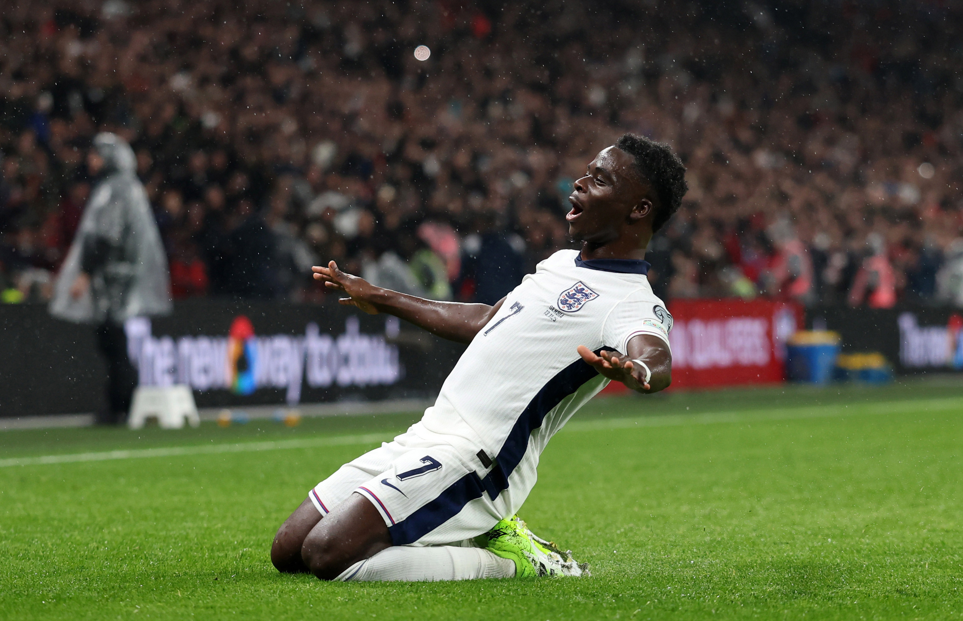 بوكايو ساكا لاعب منتخب إنجلترا يحتفل بتسجيله الهدف الأول لفريقه في الفوز على منتخب صربيا 2-صفر في مباراتهما على ملعب ويمبلي يوم الخميس ضمن التصفيات الأوروبية المؤهلة لكأس العالم 2026 - (Photo by Catherine Ivill - AMA/Getty Images)