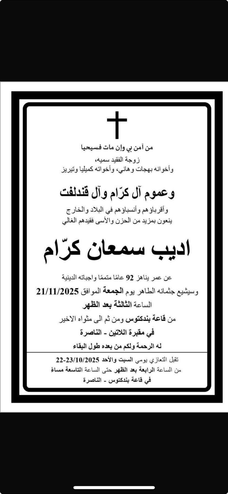 انتقل الى رحمة الله تعالى أديب سمعان كرّام عن عمر ناهز الـ 92 عاما . وسيشيع جثمانه الطاهر غدا الجمعة الساعة الثالثة بعد الظهر من قاعة بندكتوس ومن ثم الى مثواه الأخير في مقبرة اللاتين في الناصرة .