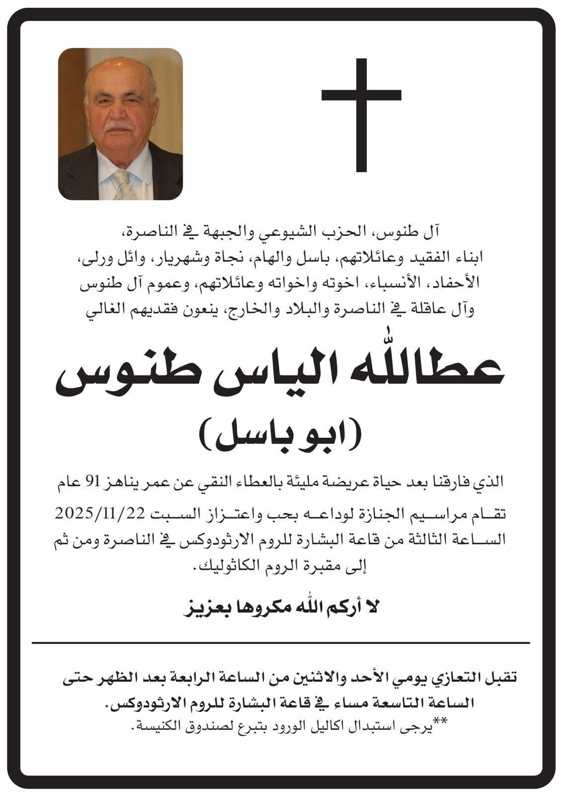 انتقل الى رحمة الله تعالى عطالله الياس طنوس ( ابو باسل ) عن عمر ناهز الـ 91 عاما . ستقام مراسم الجنازة لوداعه اليوم السبت الساعة الثالثة من قاعة البشارة للروم الارثوذكس في الناصرة ومن ثم الى مقبرة الروم الكاثوليك .