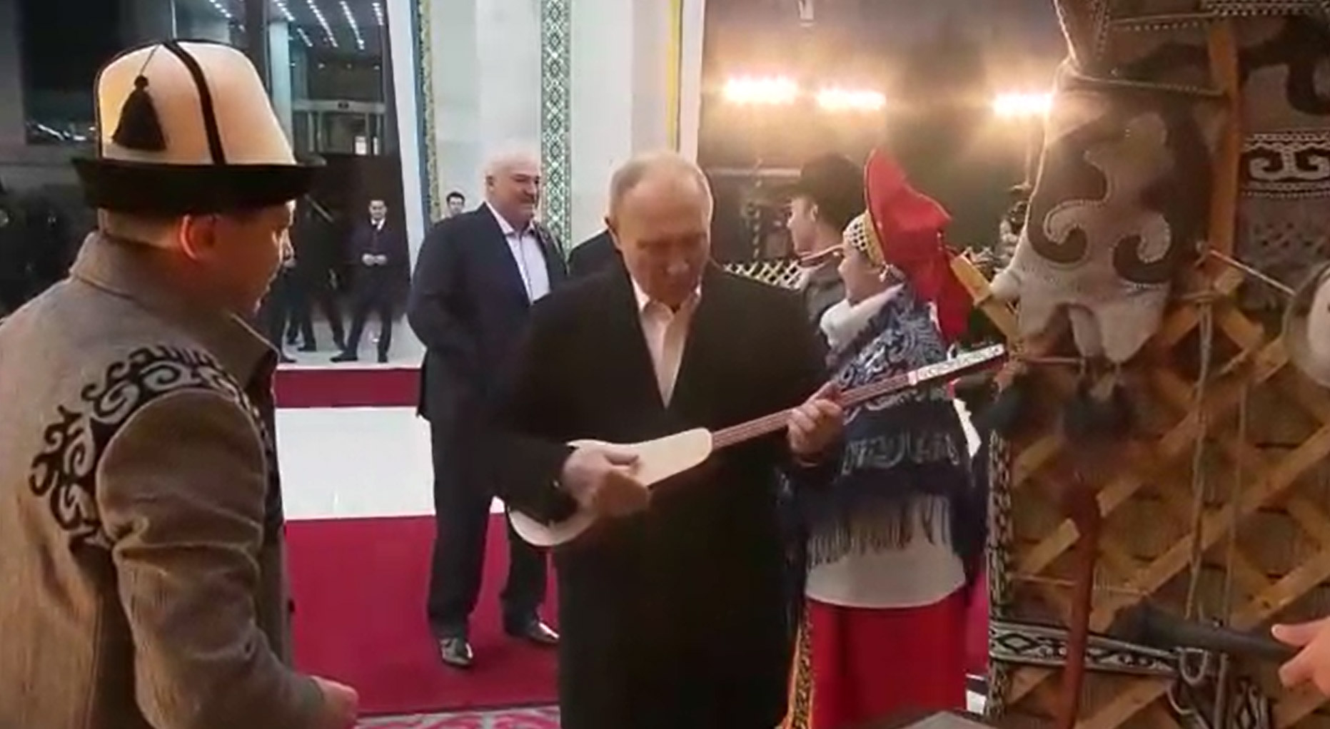 بوتين يحاول العزف على آلة الكوموز خلال زيارته لقرغيزستان