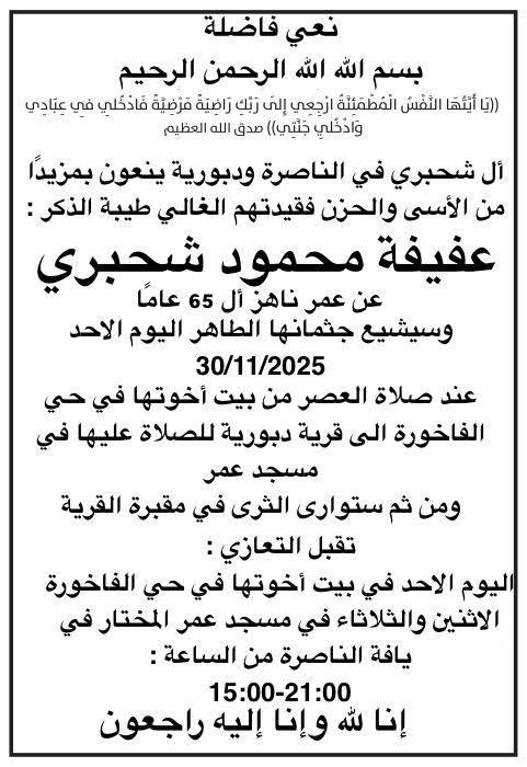 انتقلت الى رحمته تعالى عفيفة محمود شحبري من الناصرة عن عمر ناهز الـ 65 عاما .