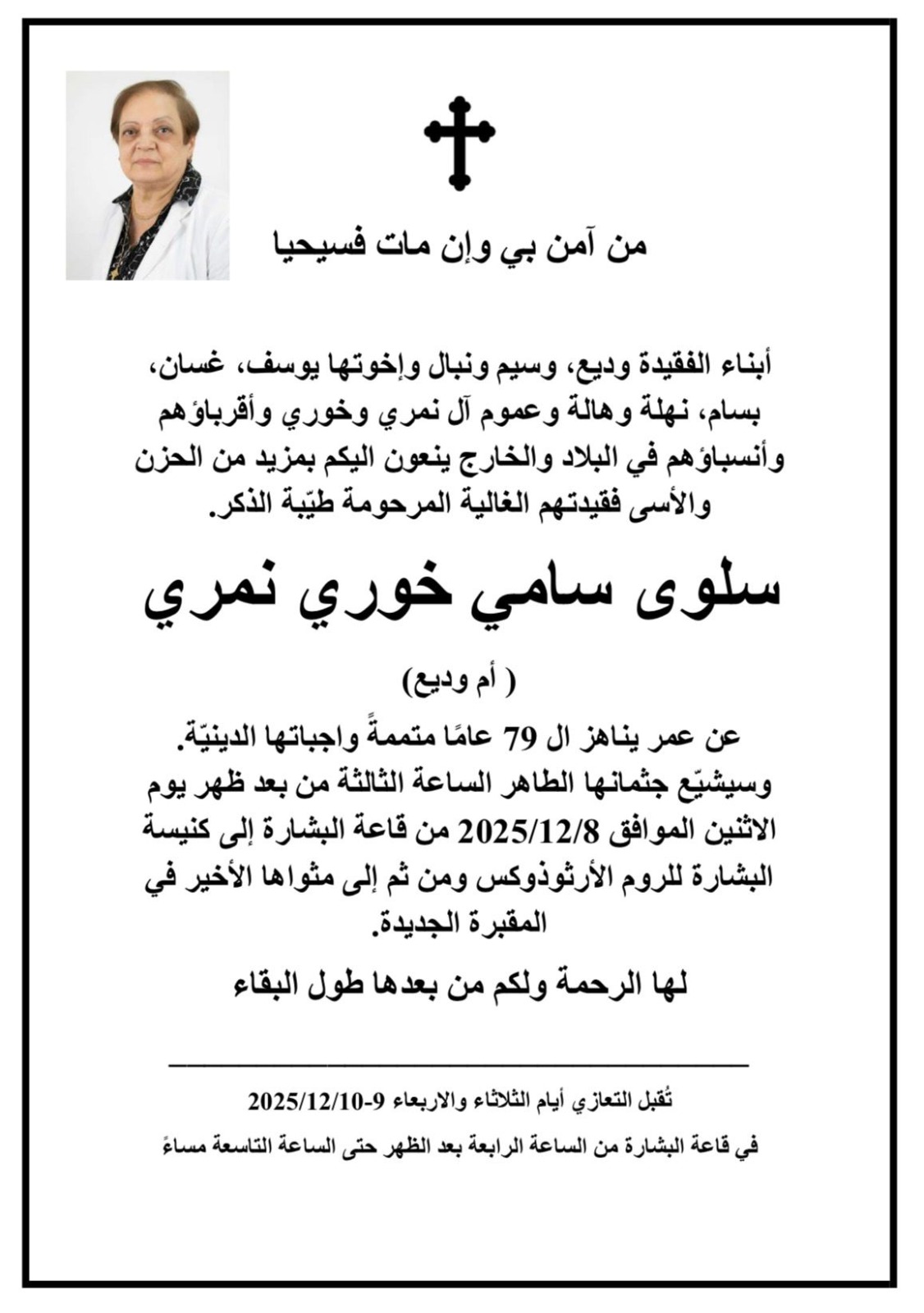 وسيشيّع جثمانها الطاهر الساعة الثالثة من بعد ظهر اليوم الاثنين من قاعة البشارة الى كنيسة البشارة للروم الارثوذكس ومن ثم الى مثواها الأخير في المقبرة الجديدة .