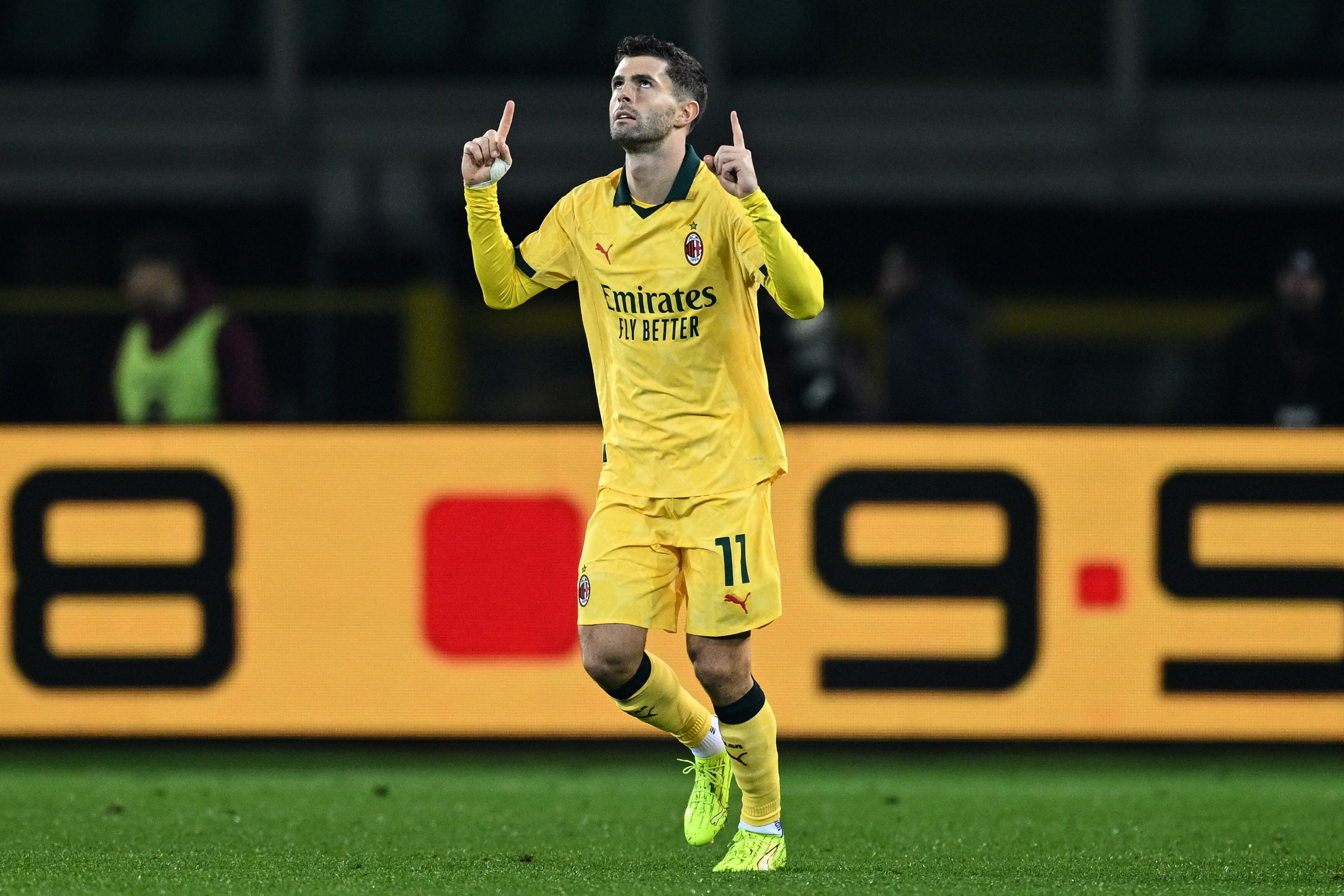 كريستيان بوليسيتش لاعب ميلان يحتفل بتسجيله الهدف الثالث في فوز فريقه على تورينو 3- 2 في مباراتهما بدوري الدرجة الأولى الإيطالي لكرة القدم. على ملعب أوليمبيكو جراندي في تورينو يوم 8 ديسمبر 2025 - (Photo by Image Photo Agency/Getty Images)