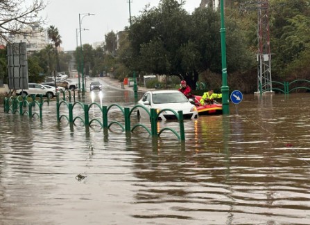 فيضانات في الخضيرة : انقاذ امرأة حاصرتها مياه الأمطار داخل سيارتها | الفيديو للتوضيح فقط - تصوير سلطة الاطفاء