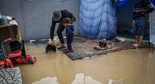 أفادت مصادر اعلام فلسطينية ان مياه الأمطار غمرت مخيمات النزوح في قطاع غزة، في ليلة أخرى قاسية تزامنًا مع تأثر المنطقة بمنخفض جوي عميق يستمر حتى ساعات مساء غدًا الجمعة، في ظل أجواء باردة ودرجات حرارة مُتدنية".