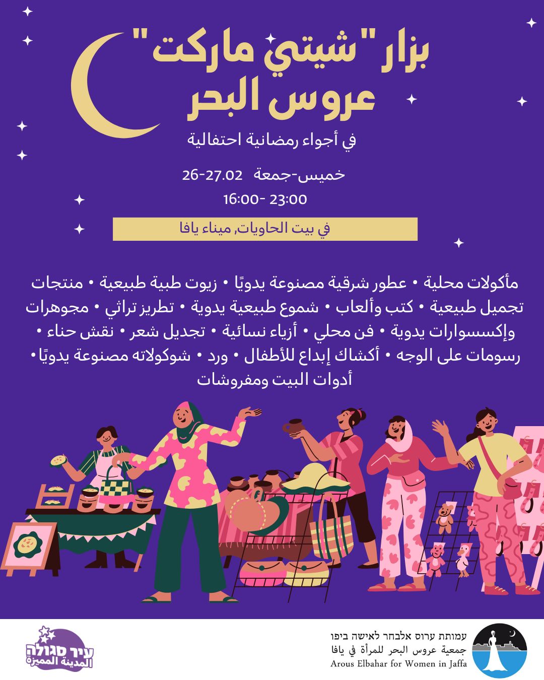 علاقات عامة | تدعوكم جمعية عروس البحر لأكبر بازار نسائي في يافا لدعم المصالح النسائية.
