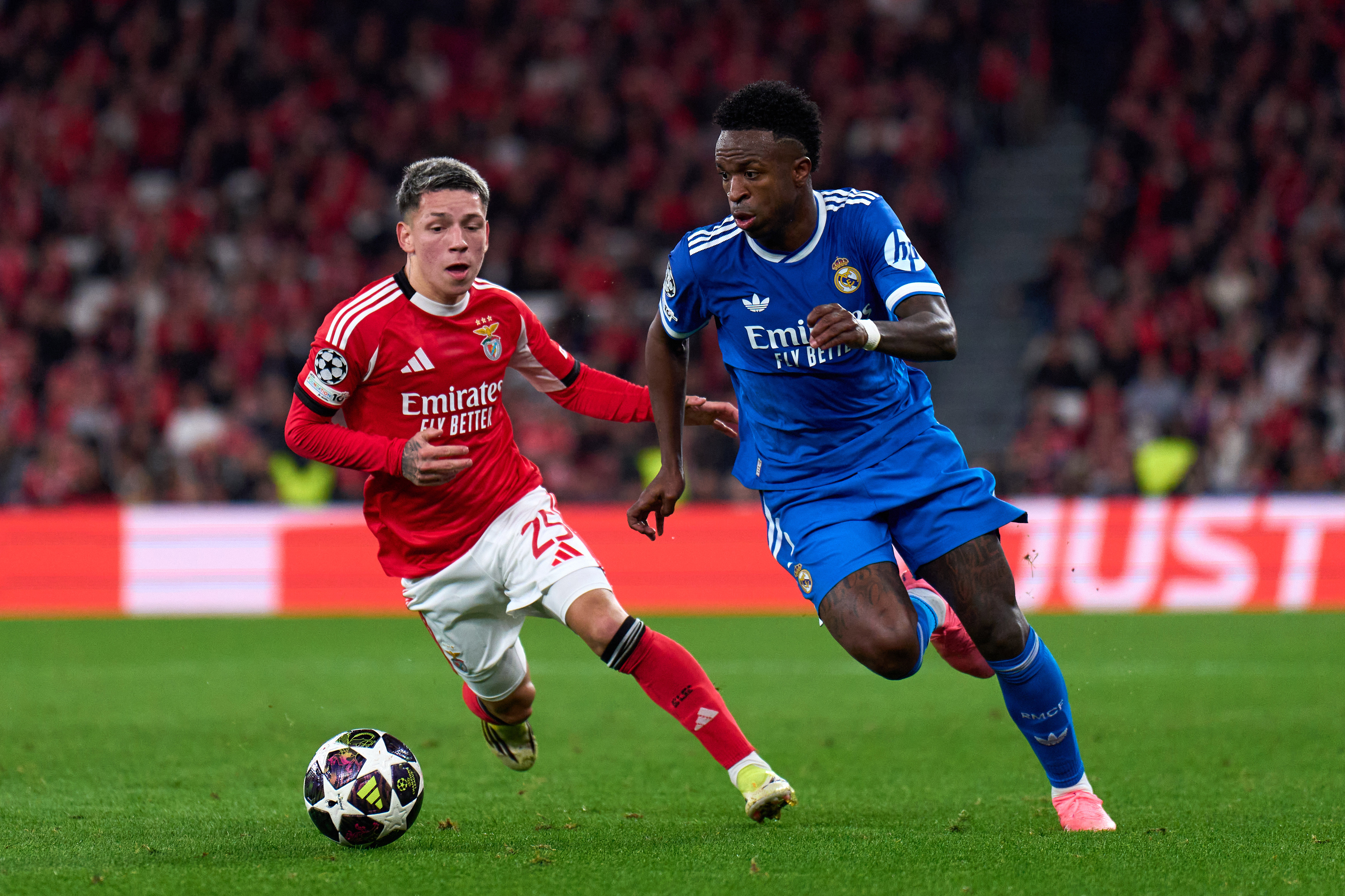 مهاجم ريال مدريد فينيسيوس جونيور في كرة مشتركة مع جيانلوكا بريستياني لاعب بنفيكا خلال مباراة الفريقين بدوري أبطال أوروبا لكرة القدم يوم 17 فبراير شباط 2026 - (Photo by Angel Martinez/Getty Images)