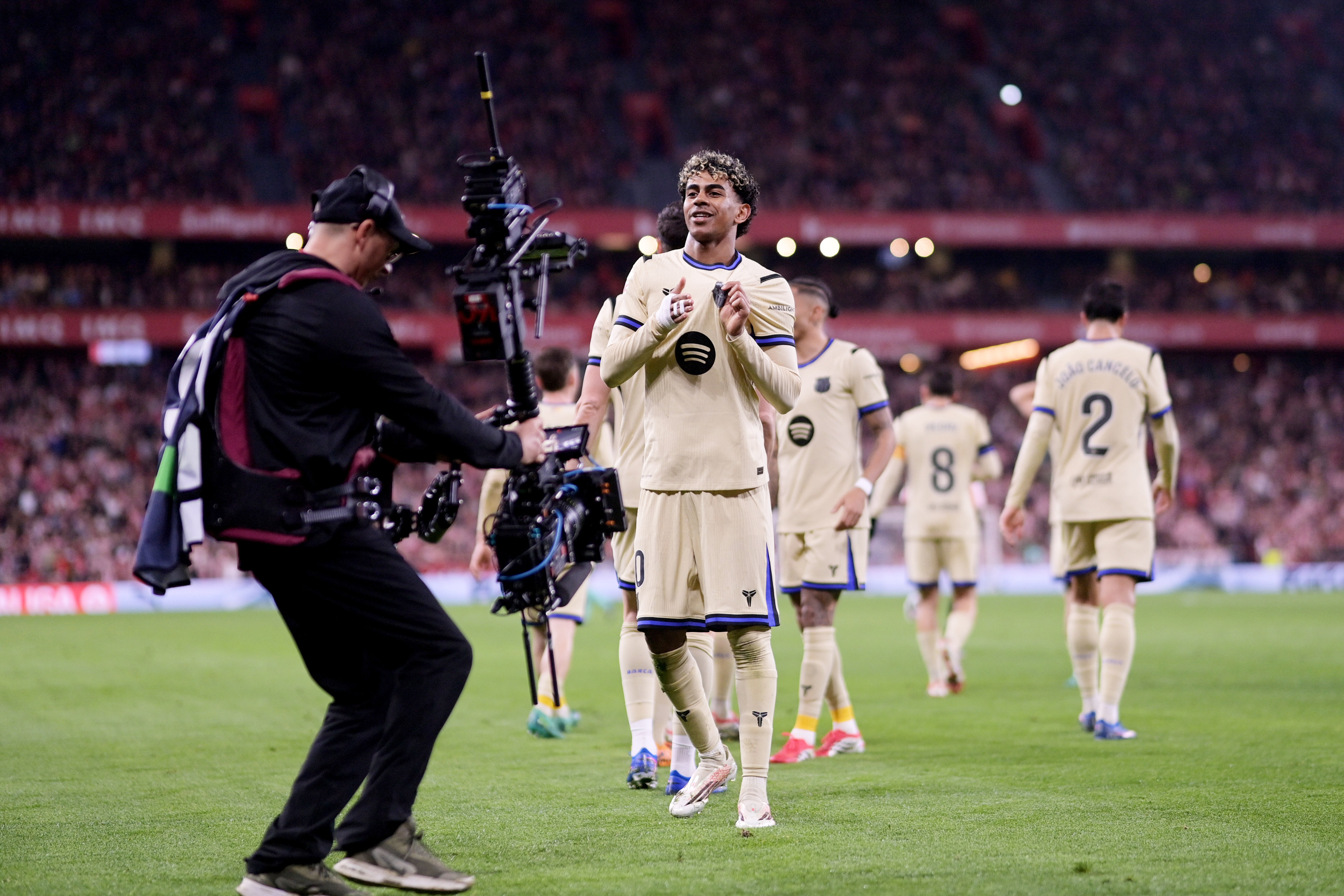 الأمين جمال لاعب برشلونة يحتفل بتسجيله الهدف الأول للفريق في الفوز 1-صفر على أتليتيك بيلباو في دوري الدرجة الأولى الإسباني لكرة القدم يوم 7 مارس آذار 2026 - (Photo by Cesar Ortiz/Soccrates/Getty Images)