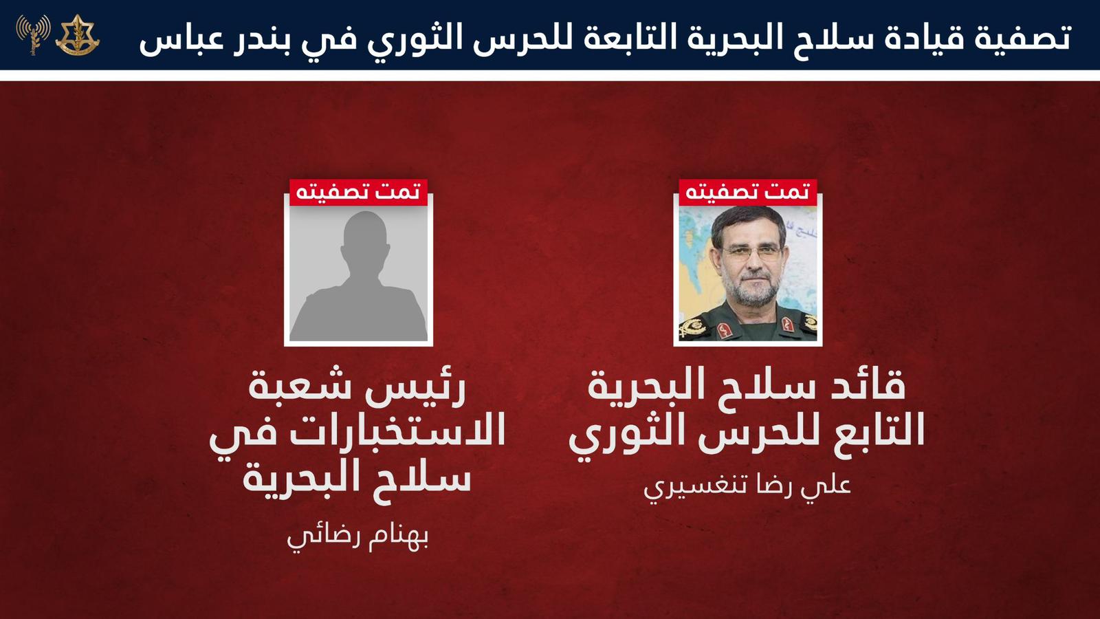 قال الجيش الاسرائيلي في بيان صادر عنه " ان سلاح الجو شنّ بتوجيه استخباراتي دقيق غارة خلال الليلة الماضية في منطقة بندر عباس وقضى على علي رضا تنكسيري قائد سلاح البحرية في الحرس الثوري خلال السنوات الثماني الأخيرة".