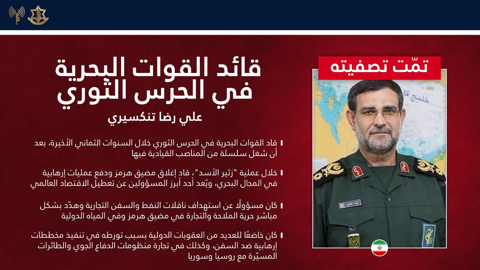 وجاء في بيان الجيش الاسرائليي:" شغل تنكريسي سلسلة مناصب مركزية في سلاح البحرية التابع للحرس الثوري حيث أشرف على أنشطة الإرهاب البحري للنظام وقام بتنسيق بين القوات العسكرية الإيرانية في منطقة الخليج. وعلى مدار سنوات كان مسؤولًا عن استهداف ناقلات النفط والسفن التجارية وهدد بشكل مباشر حرية الملاحة والتجارة في مضيق هرمز وفي المجال البحري الدولي. إلى جانب تنكسيري، قُتل أيضًا رئيس هيئة الاستخبارات في سلاح البحرية بهنام رضائي".